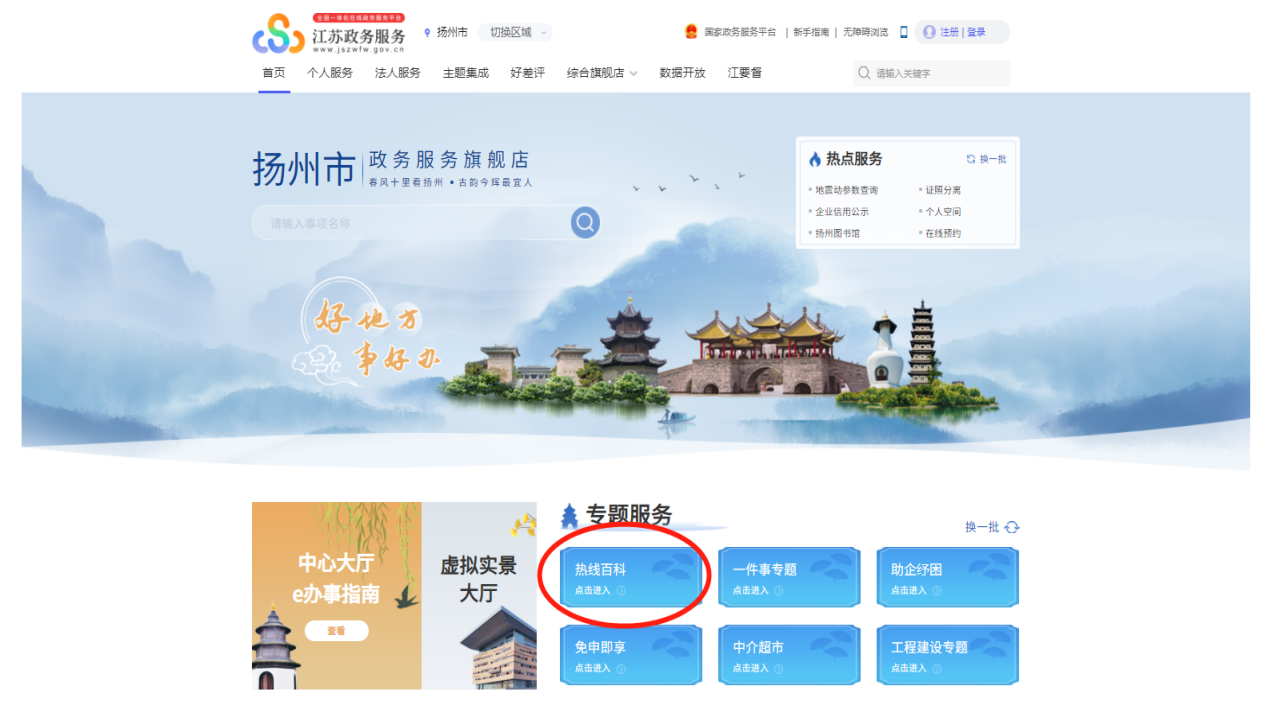 为进一步拓宽企业、群众知悉掌握政务服务信息渠道,高效满足企业群众对热点政务信息的需求,扬州市依托省级12345平台,融合江苏政务服务网,在扬州市政务服务旗舰店C位开辟“热线百科”专栏,供企业、群众随时搜索、查询和使用。