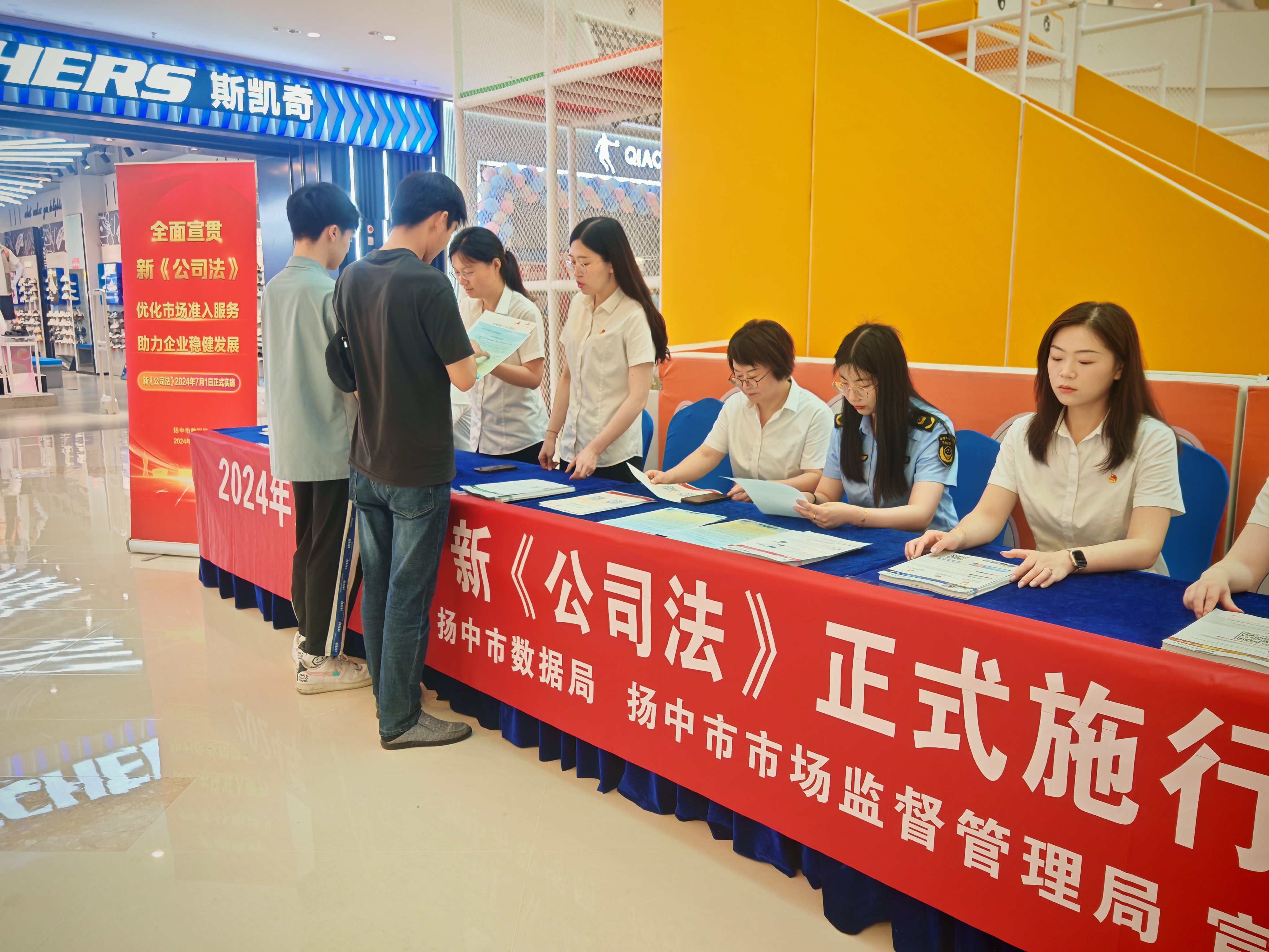 7月1日上午,扬中市数据局联合市场监管局走进扬中吾悦广场,通过摆摊设点、答疑解惑的方式,面对面向企业、群众宣传解读新修订的《中华人民共和国公司法》。