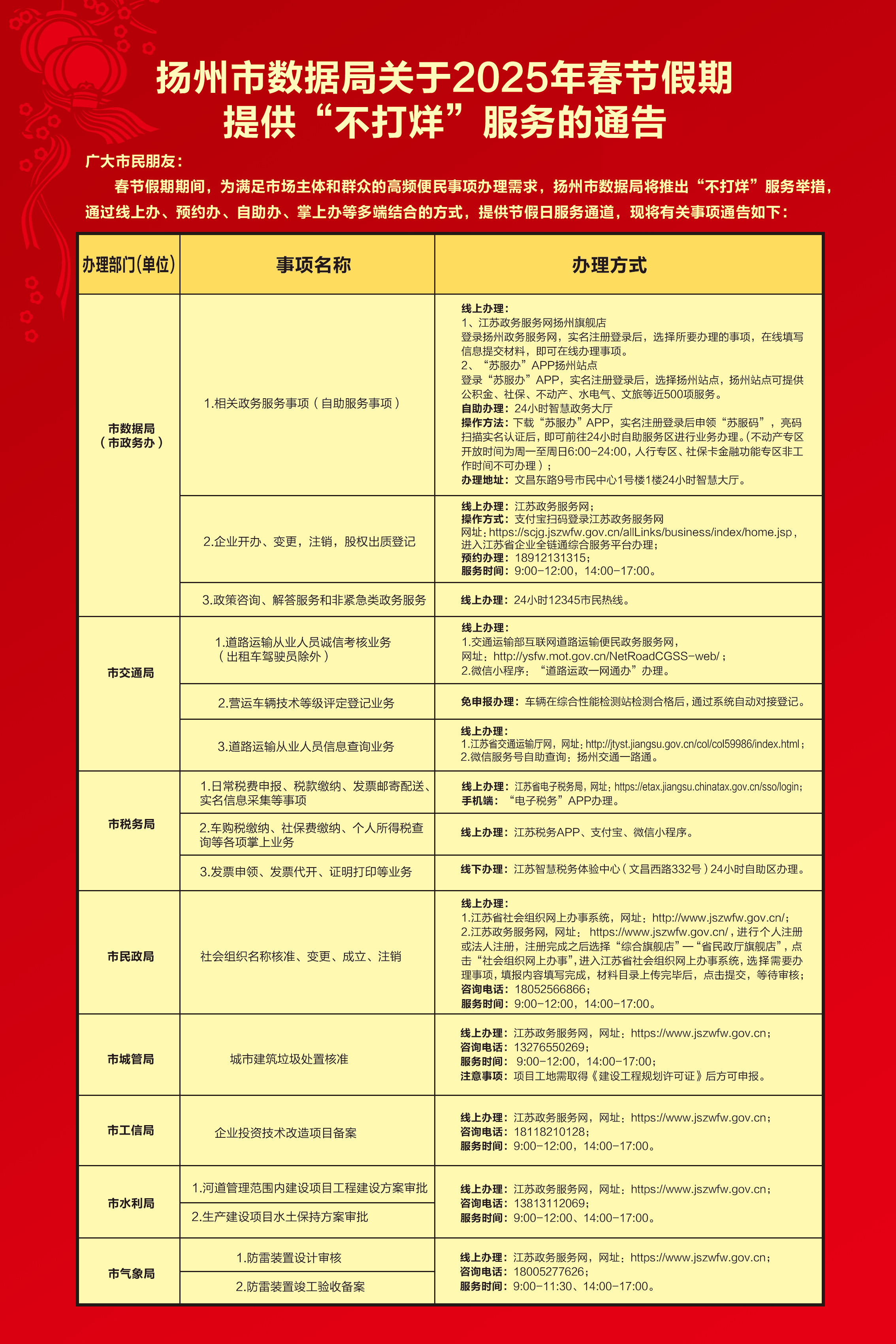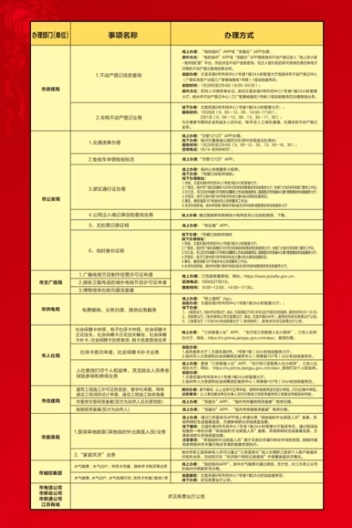 增效能,持续推动贴心服务。扬州市数据局持续在春节期间推动政务服务事项“延时服务”,公安、税务、医保、社保、不动产和公积金等20个窗口单位提供企业开办、税费申报、不动产登记信息查询以及社会保障卡申领等高频民生事项办理服务。同时,“苏服办”APP扬州站点提供公积金、社保等近500项服务,涵盖生活诸多领域。广大群众可根据各自需要办理的具体事项,按照对应的部门、对应的时间、对应的方式进行办理,其中政策咨询、解答服务和非紧急类政务服务,可拨打12345市民热线,热线将24小时为您服务。让群众能安心办成事,不耽误返岗上班和外出务工。
