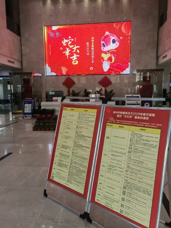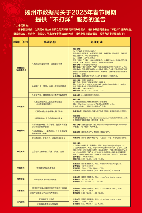 新春佳节已近,扬州市数据局秉持“以群众为中心”的服务理念,持续推出“不打烊”服务举措,通过线上办、预约办、自助办等多端结合方式,为市民提供优质、贴心的政务服务。