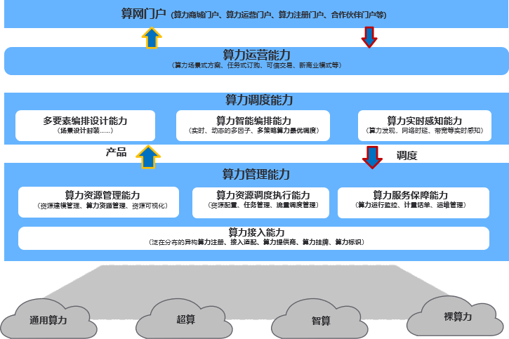 平台以“采集与控制模块”为枢纽,向下对接通算、超算、智算、边缘计算等多类资源,向上依托统一纳管感知、任务式调度等六大能力,覆盖资源纳管、场景 API 设计、意图匹配等细分功能,实现算力全链路的高效统筹、智能调度与可信运营,是支撑“全网算力一张网”的关键技术平台。