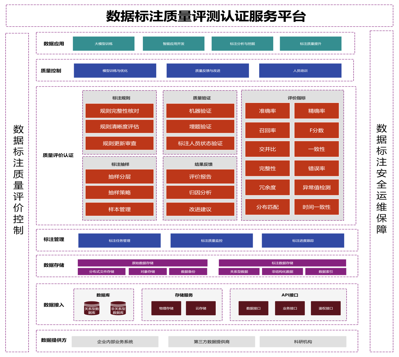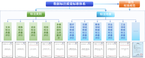 数据标注行业多样,不同行业供需双方对标注质量要求各异,缺乏统一标准,企业缺乏专业的数据标注质量评价工具和方法,缺少第三方评价以保证客观性。钟吾大数据集团通过统一质量标准体系(图一),构建多级标注质量指标,标准贯标后,数据质量提升1-2个评价级别,提高标注效率20%以上。联合CQC借助数据标注质量检测技术,快速检查标注结果,缩短人工审核时间30%以上。建设数据标注质量评测认证服务平台(图二),联合各方共享技术资源,协同各方打通数据标注到应用全流程链条,解决企业按项目制交付、缺乏成体系的数据标注质量管理问题。