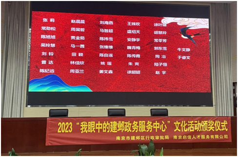 为体现行政审批及政务服务工作成效,展现政务服务中心全体职工丰富多彩的精神文化生活和蓬勃向上的精神风貌,加强政务中心文化艺术建设、丰富员工文化生活,在营造向上氛围的同时开发员工创新精神,构建和谐的政务服务中心。由南京市建邺区行政审批局主办,南京启信人才服务有限公司承办的2023年“我眼中的建邺政务服务中心”文化活动,于10月至11月在建邺区政务服务中心举行。