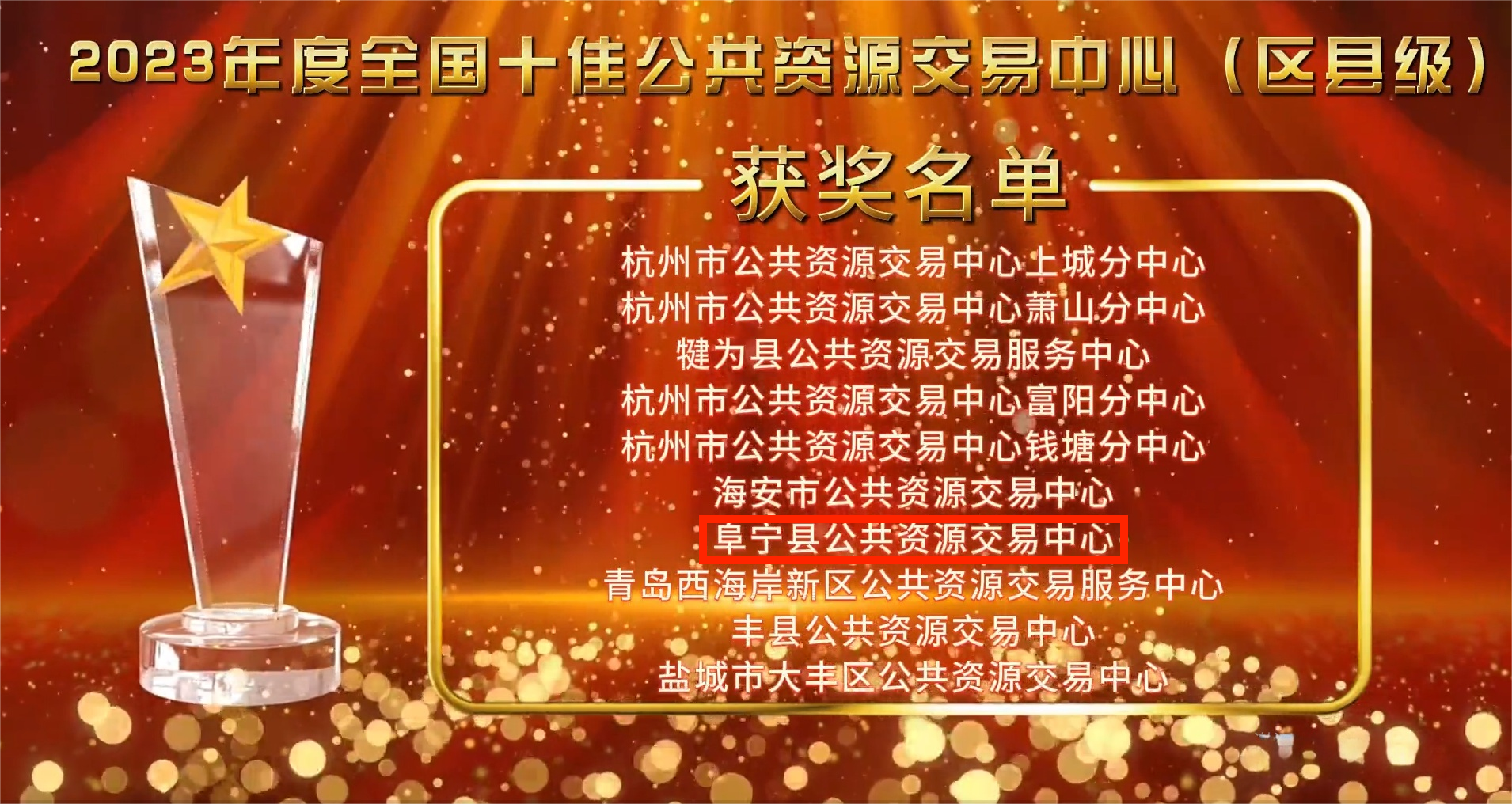 近日,2023年公共资源可持续发展论坛暨公共资源交易年会(第十届)召开,会上揭晓了2023年度全国公共资源交易评选和科技成果大赛的获奖名单,盐城市阜宁县公共资源交易中心获评“2023年度全国十佳公共资源交易中心(区县级)”。