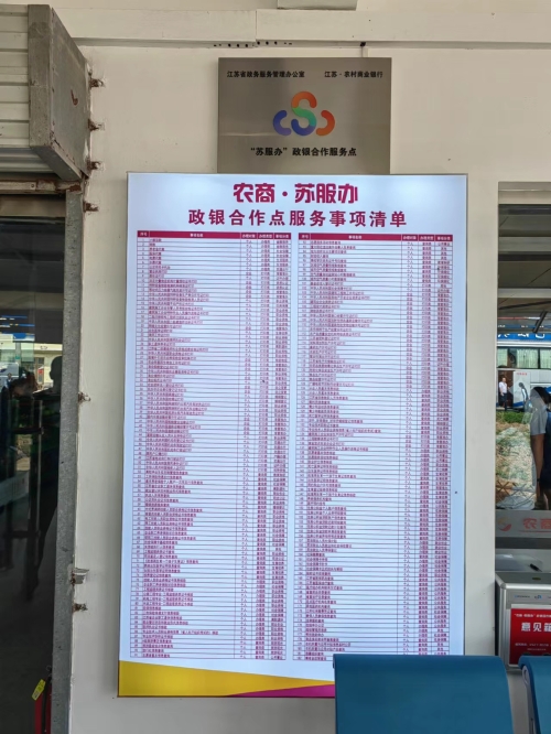 去年10月,省联社与省政务办签订战略合作协议,“农商·苏服办”政银合作品牌同步揭牌。省联社和省政务办决定,在做实做好省政府民生实事的基础上,再建设1万个村(社区)级政银合作网点。双方选取泗阳县、宜兴市,开展政银合作网点标准化建设试点。5月,240项“农商·苏服办”服务事项,成功加载至农村金融服务站的智能终端,打通农村政务服务“最后一百米”。