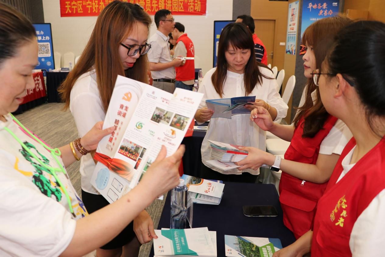 青龙街道办事处志愿者向园区企业和群众详细介绍便民服务中心可办理服务事项。
