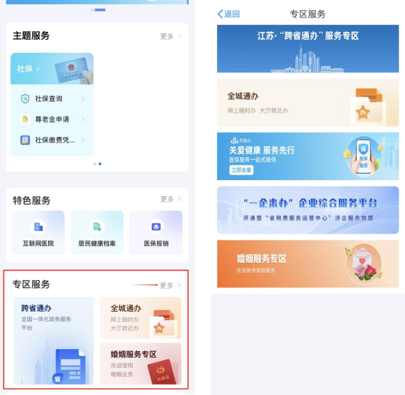 “专区服务”板块,包括跨省通办、全城通办、婚姻服务专区、医保服务、企业综合服务平台等服务专区。