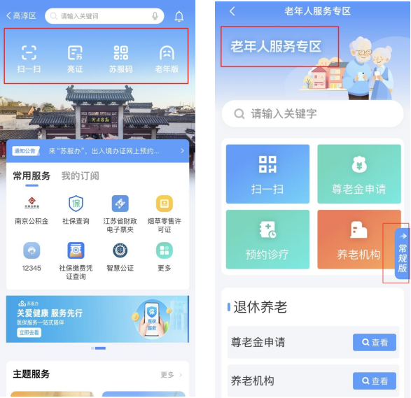 旗舰店首页头部位置设置为“高频服务”板块,包含扫一扫、亮证、苏服码等用户使用频次较高的操作。同时针对老年人群体提供老年人服务专区,点击“老年版”即可一键切换至大字版页面,方便老年人使用。
