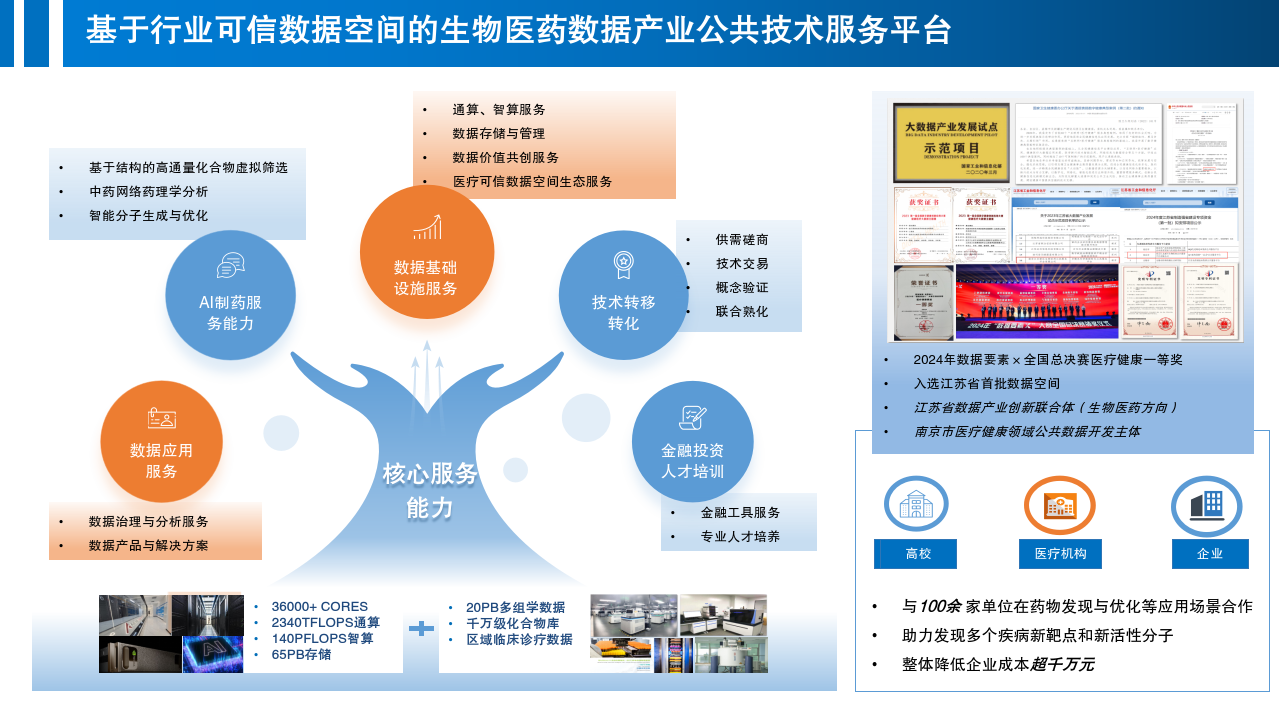 核心能力:基于行业可信数据空间的生物医药数据产业公共技术服务平台,由南京江北新区生物医药公共服务平台有限公司建设运营。依托医疗健康行业可信数据空间建设,打造“高校技转中心+数据转化中心”双轮驱动的产业生态。