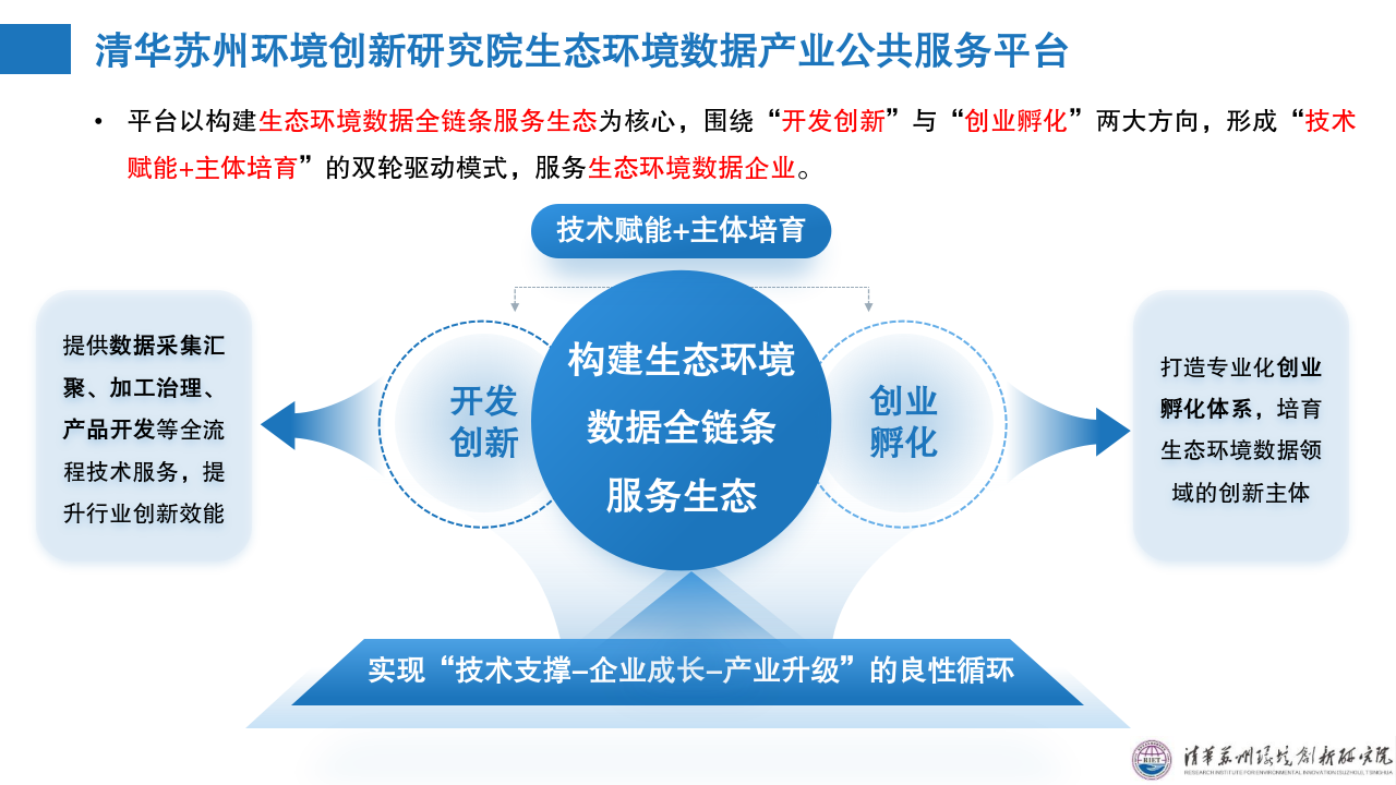 核心能力:清华苏州环境创新研究院生态环境数据产业公共服务平台,由清华苏州环境创新研究院建设运营,以构建生态环境数据全链条服务生态为核心,围绕“开发创新”与“创业孵化”两大方向,形成“技术赋能+主体培育”的双轮驱动模式。