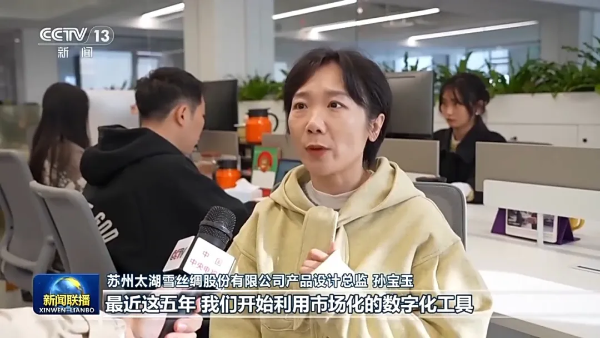 苏州太湖雪丝绸股份有限公司产品设计总监 孙宝玉:最近这五年,我们开始利用市场化的数字化工具,从中国传统纹样以及市场上的数据库里找灵感,设计出了许多爆品。目前我们的直播电商销售额翻了一番,跨境电商每年也都保持两位数的增长。