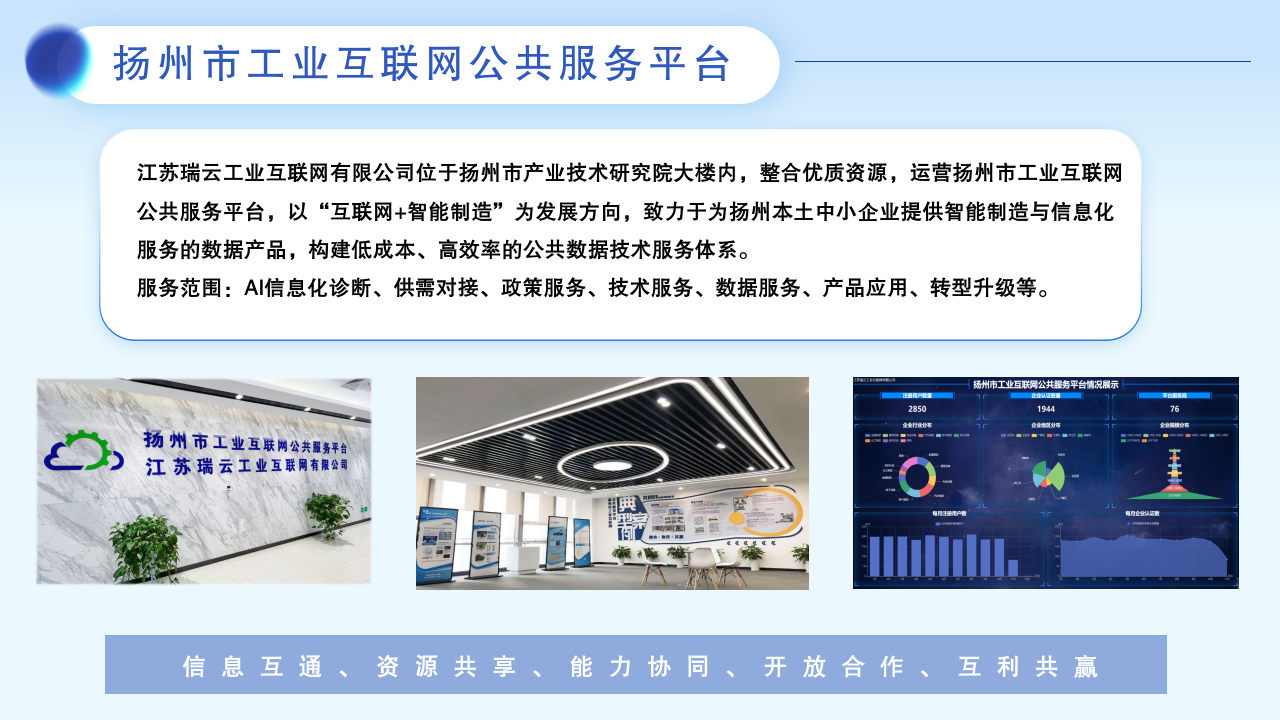 核心能力:扬州市工业互联网公共服务平台(瑞云工业互联网平台),由江苏瑞云工业互联网有限公司牵头建设运营。致力于为扬州本土中小企业提供智能制造与信息化服务的数据产品,构建低成本、高效率的公共数据技术服务体系,助力企业实现数据价值最大化,提升生产效率与市场竞争力,推动扬州市制造业数字化转型升级。