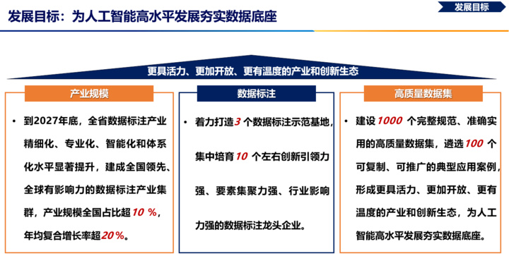 《方案》绘画出了江苏数据标注产业的“3年发展蓝图”:力争到2027年底,全省数据标注产业精细化、专业化、智能化和体系化水平显著提升,建成全国领先、全球有影响力的数据标注产业集群,产业规模全国占比超10%,年均复合增长率超20%。着力打造3个数据标注基地,集中培育10个左右创新引领力强、要素集聚力强、行业影响力强的数据标注重点企业,建设1000个完整规范、准确实用的高质量数据集,遴选100个可复制、可推广的典型应用案例,形成更具活力、更加开放、更有温度的产业和创新生态,为人工智能高水平发展夯实数据底座。