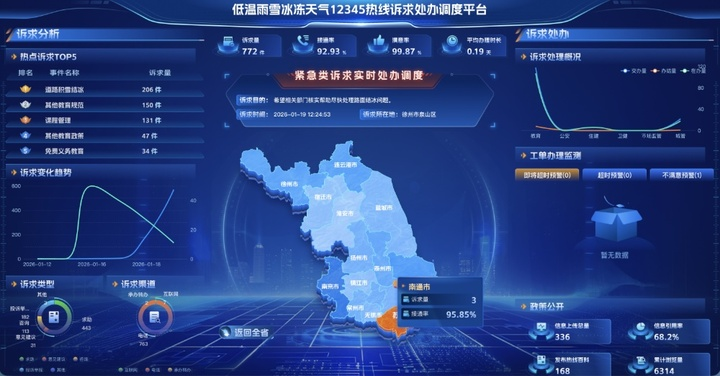 据气象部门预报,1月18日至23日,江苏有大范围寒潮大风、低温雨雪冰冻天气,中北部地区中到大雪、局部暴雪,1月21日至23日全省将持续出现低温冰冻。为了高效解决群众积雪结冰、交通出行、水电气热保障等诉求,省数据局迅速印发《关于启动低温雨雪冰冻诉求联动处办机制的通知》,部署6条工作措施。会同省公安厅、交通运输厅、住建厅等部门,在省12345热线现场,设立了江苏省低温雨雪冰冻诉求联动处办调度中心,监测调度各市诉求办理情况。联动省气象台开展全省12345热线民声接听员业务培训。对寒潮诉求实行统一标签化管理,开辟快速服务通道。迅速归集全省低温雨雪冰冻相关信息168条,并在“热线百科”发布,便利群众随时查阅使用。