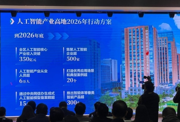 当天出炉的《雨花台区加快打造“智能引领、数实融合”产业体系三年行动计划(2026—2028年)》勾勒出发展路径:到2028年,全区软件业务收入力争突破4500亿元,人工智能核心产业规模超800亿元,培育超过10家收入过五十亿元的软件及人工智能领域领军企业,为南京打造具有全国影响力的人工智能产业发展高地提供重要支撑。