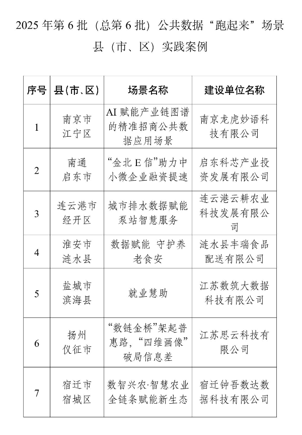 为深入贯彻落实党中央、国务院关于激活数据要素价值的决策部署,扎实推进数字江苏建设,近日,省数据局组织开展公共数据“跑起来”场景县(市、区)实践案例征集工作。经综合研判,确定7个场景纳入2025年第6批(总第6批)公共数据“跑起来”县(市、区)实践案例,推动数据资源开发利用提质增效。